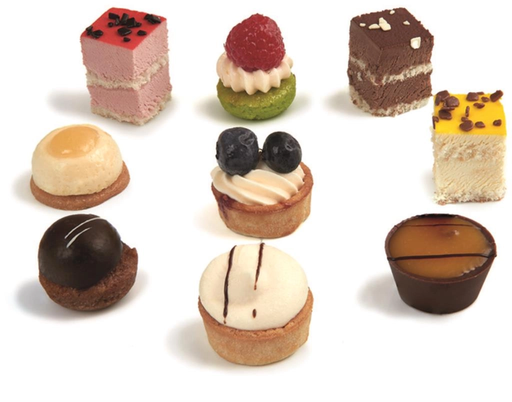 9 sabores: Tartaletas de limón, pastelitos de chocolate blanco, pastelitos de chocolate negro, tartaletas de fruta, vasitos de maracuyá, pastelitos de frambuesa, pastelitos de frutos rojos, pastelitos de queso, ganache de chocolate.