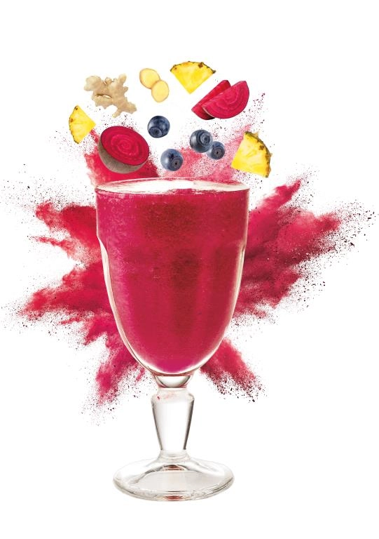 40% remolacha, 40% piña, 15 arándanos, 5% jengibre.