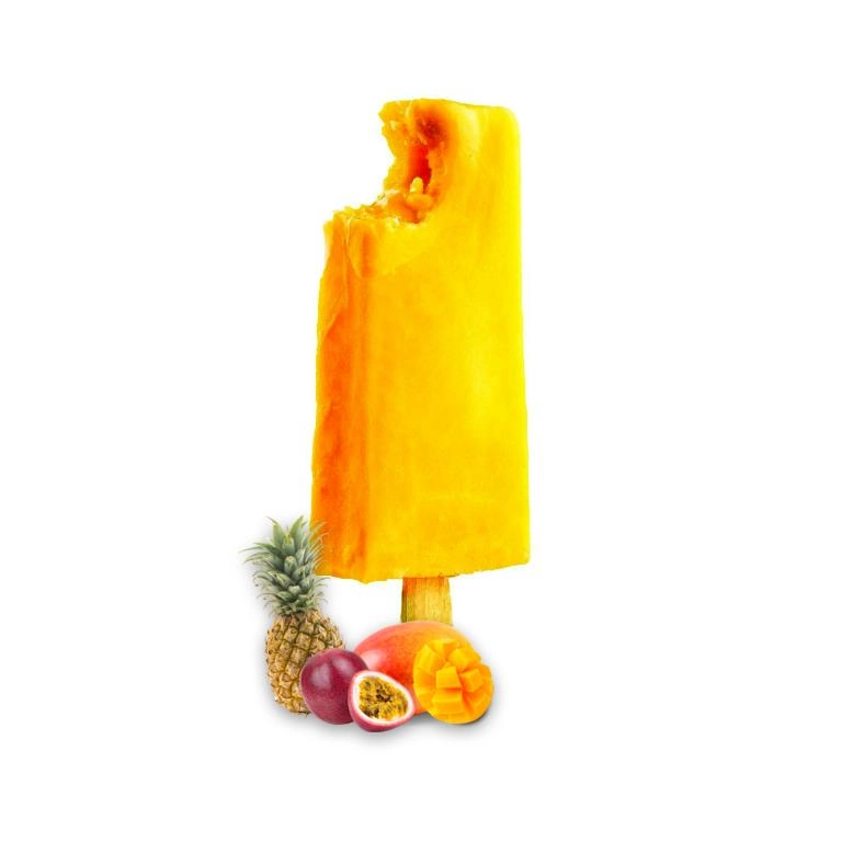 Sorbete. 54% de pulpas tropicales (mango, piña y maracuyá) con un toque de zumo de limón.