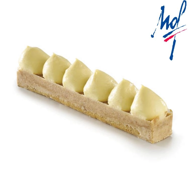 Pasta sablé, crujiente de chocolate blanco y crema de limón de Sicilia. ±16 x 2,5 x 4 cm