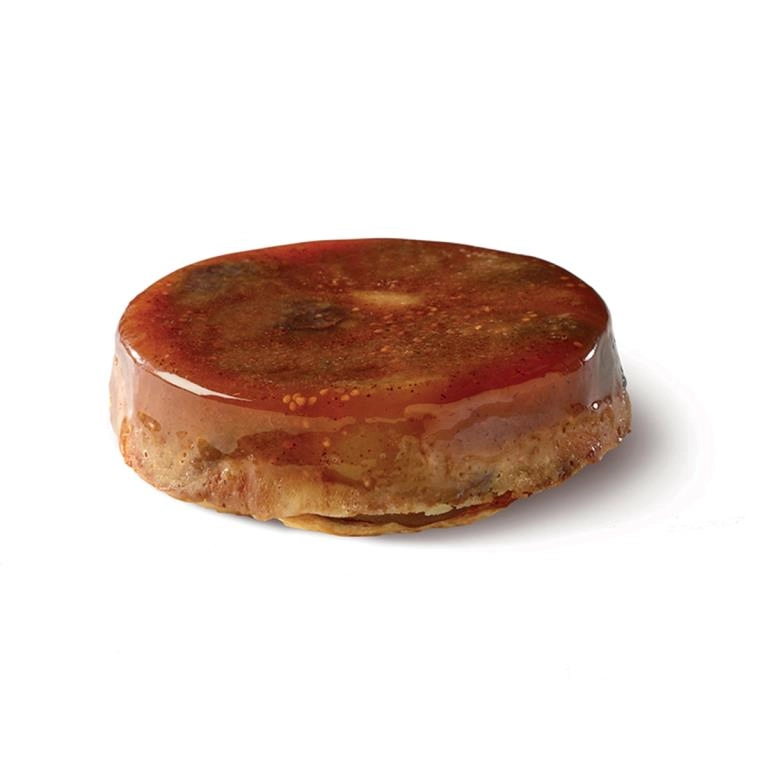 Pasta dulce con almendras en polvo, higos frescos caramelizados, caramelo. ±Ø 9,5 x 2,5 cm