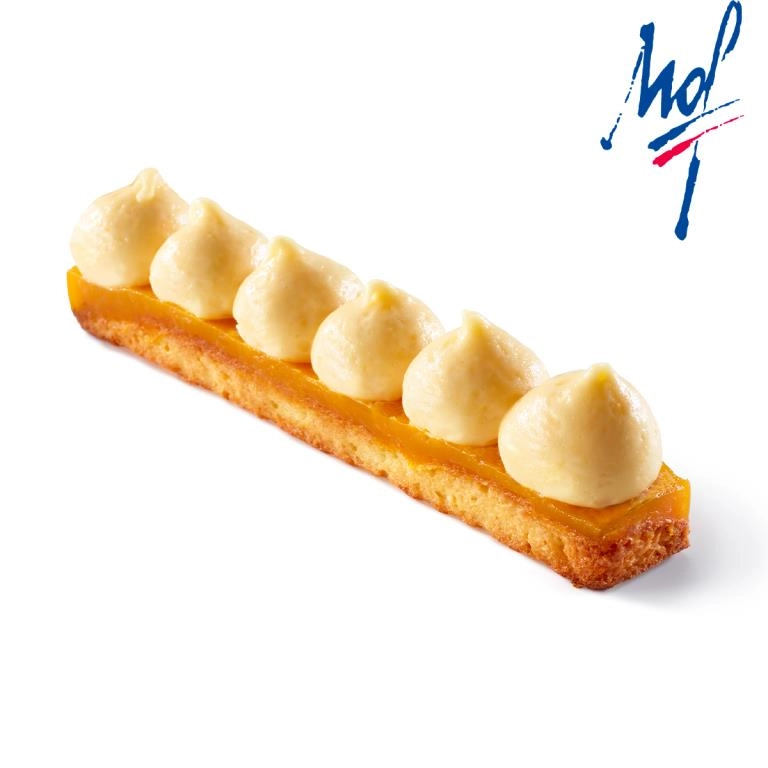 Bizcocho de almendra y coco, compota de mango-maracuyá, crema Chiboust al ron. ±16,5 x 2,5 x 3 cm