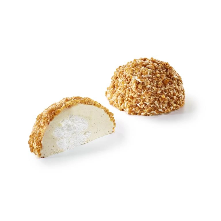 Helado de leche fresca con infusión de vainilla Bourbon, doble relleno de merengue, cobertura de nata montada y pepitas de turrón. ±8 x 4,5 cm