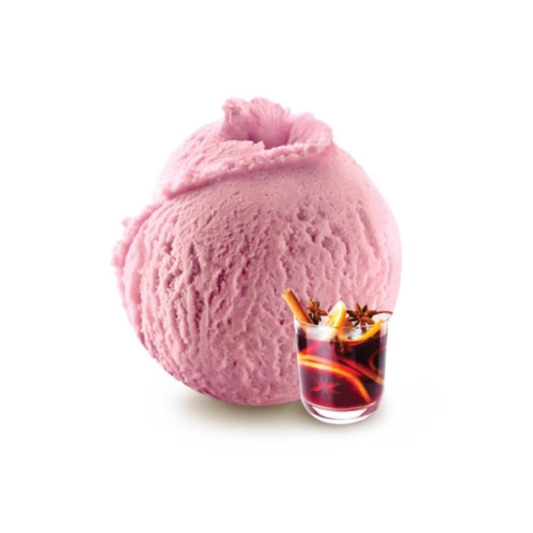 Sorbete. Vino tinto, ralladura de naranja, infusión de especias: canela, anís estrellado, cardamomo, clavo y pimienta negra.