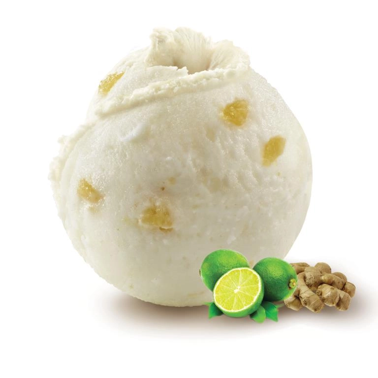 Sorbete de lima con trocitos de jengibre cristalizado. Hemos aceptado el reto de combinar dos sabores sensacionales en el mismo sorbete. El 32 % de limón verde (reconstituido) forma la base de esta receta fresca y muy ligera, con un sabor intenso y acidulado. Los trocitos de jengibre confitado que salpican la mezcla aportan la intensidad y azúcar justos para conseguir un equilibrio perfecto.