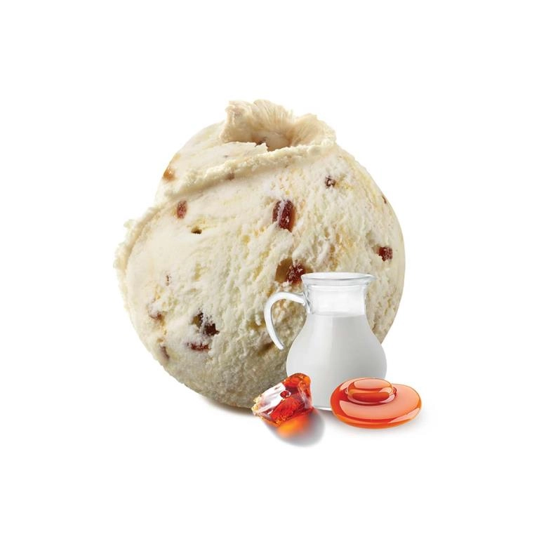 Helado de fior di latte, salsa de caramelo y trocitos crujientes de caramelo.