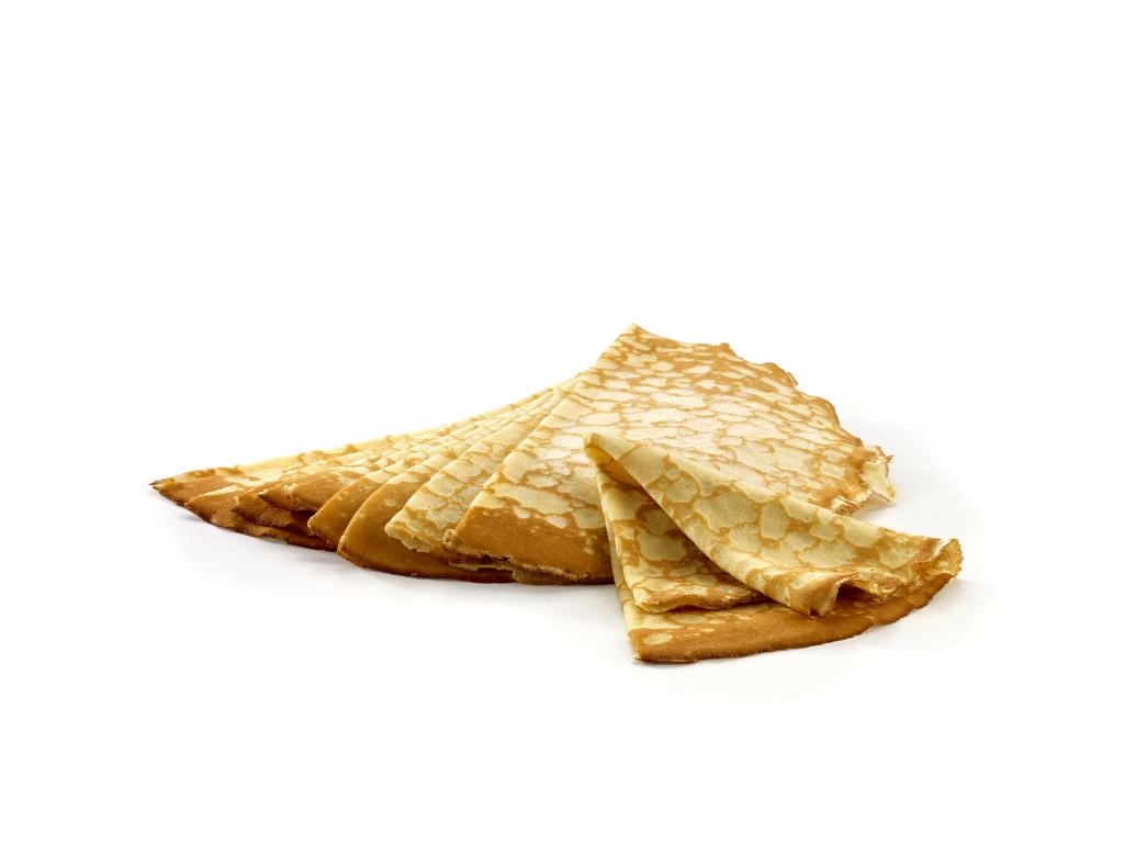 Crepes de huevos, leche fresca, mantequilla, aromatizados con flor de azahar. Crepes dobladas por la mitad. ±Ø 25 cm