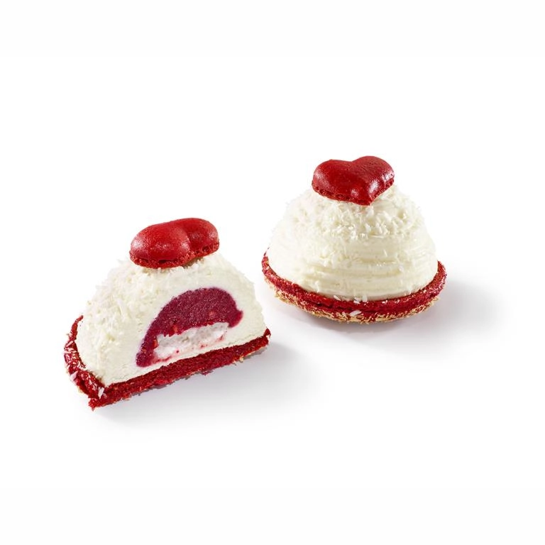 Tapa de macaron, mousse de coco, corazón de frambuesa y virutas de merengue.
