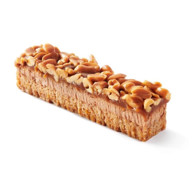 Crujiente de cacahuete, dacquoise de avellana, mousse de chocolate con leche, caramelo suave, cacahuetes salados tostados.