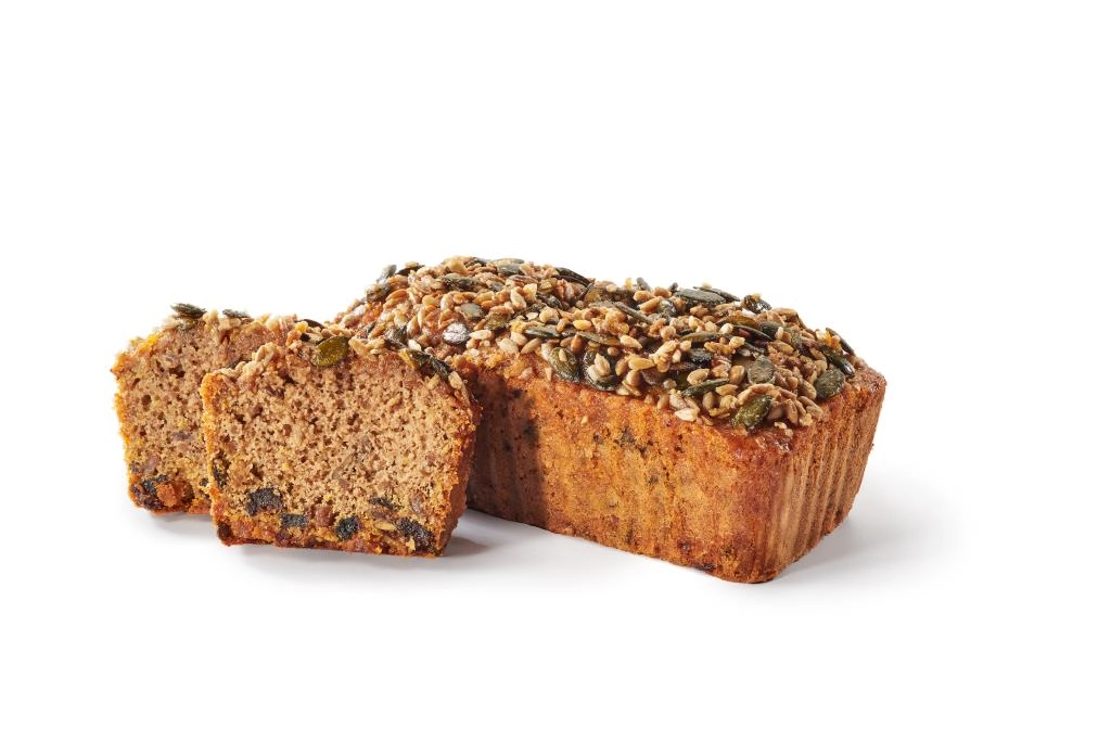 Harina de mijo, harina de trigo tostada, sirope de arce de la familia Michaud, ciruelas pasas y pasas doradas. Decorado con semillas de calabaza y girasol caramelizadas y tostadas, y cubierto con sirope de arce.