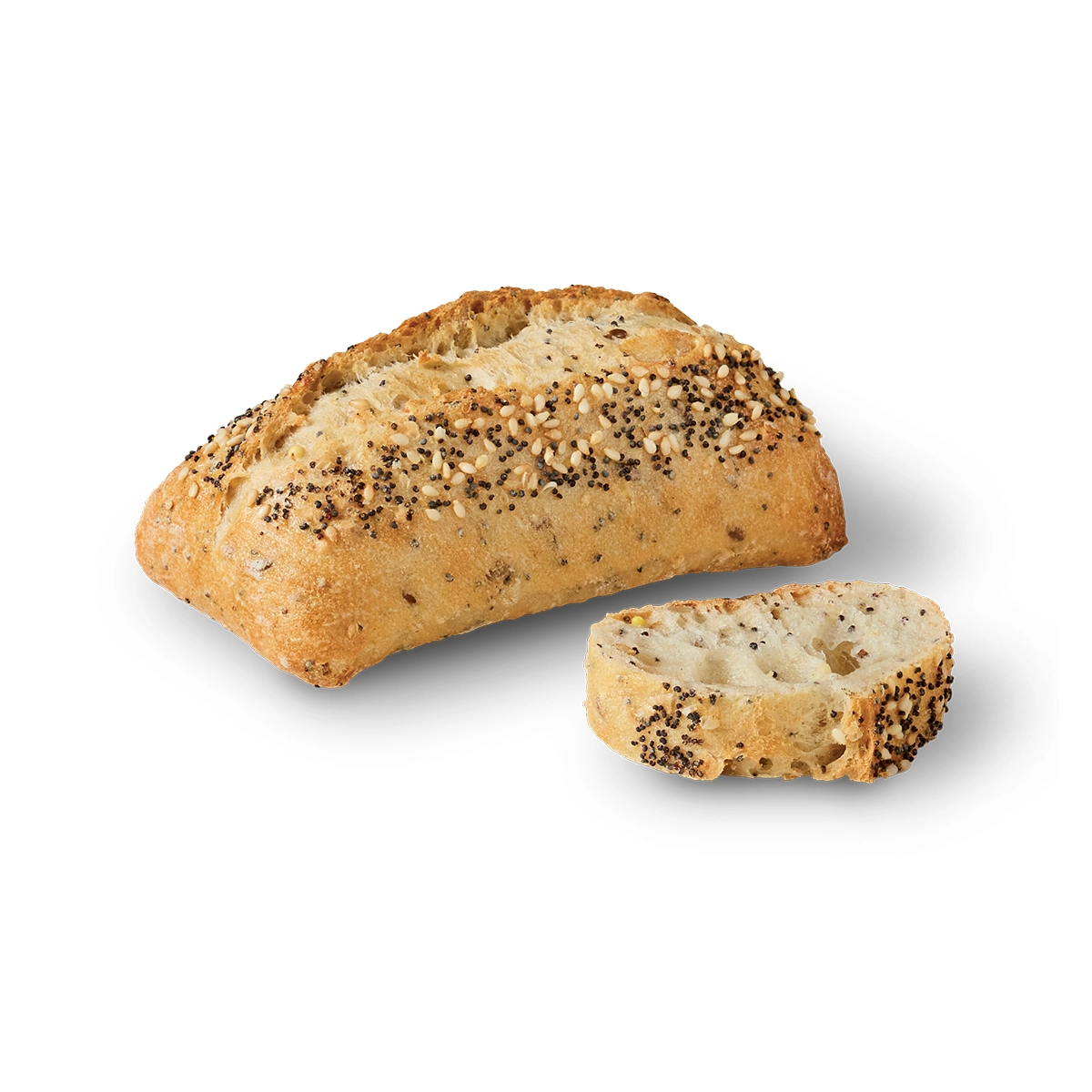 Harina de trigo, sello de calidad "Label Rouge", semillas de sésamo y amapola, miga con semillas de girasol, amapola, mijo, sésamo, lino dorado y lino marrón. ±12 x 6 x 4 cm
