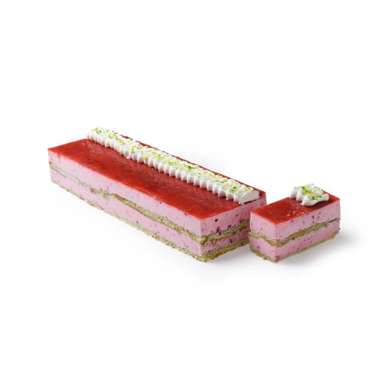 Bizcocho de pistacho, mousse de frutos rojos, acabado con glaseado de frambuesa. Decorado con nata y trocitos de pistacho.
